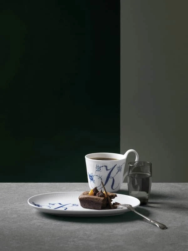 Royal Copenhagens Alfabetkrus er håndmalet med et enkelt og nøje udført penselstrøg, som giver et klassisk, blåmalet strejf af personlighed. Hver højhankskop er unik og har et malet bogstav på den ene side og en reference til det Musselmalet Riflede stel på den anden. Bogstavet er koblet sammen med to palmetter, som er et klassisk element fra Royal Copenhagen.