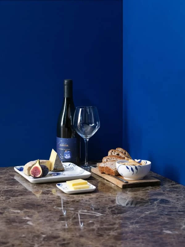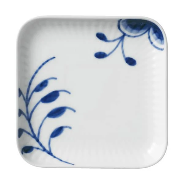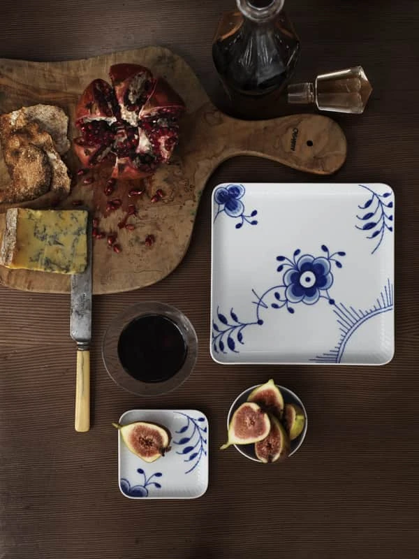 Server portionsanrettede mundbidder på den lille asiet fra Royal Copenhagen. Den lille størrelse er dog ikke en hindring for at lade det Blå Mega Mussel mønster brede sig på det hvide porcelæn.