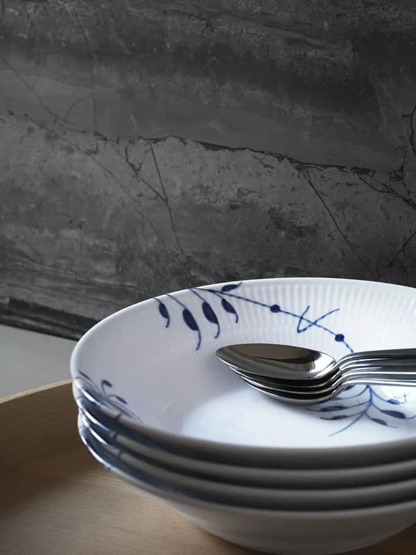I 2000 skabte Karen Kjældgård-Larsen Blå Mega Mussel serien med inspiration fra det velkendte musselmalet – småt og blåt. Blå Mega Riflet er beviset på, at selv de bedste traditioner kan holde til at blive udfordret – stort og blåt. De store penselstrøg på det hvide porcelæn skaber et sofistikeret og kontrastfyldt udtryk, der klæder det moderne, nordiske hjem.