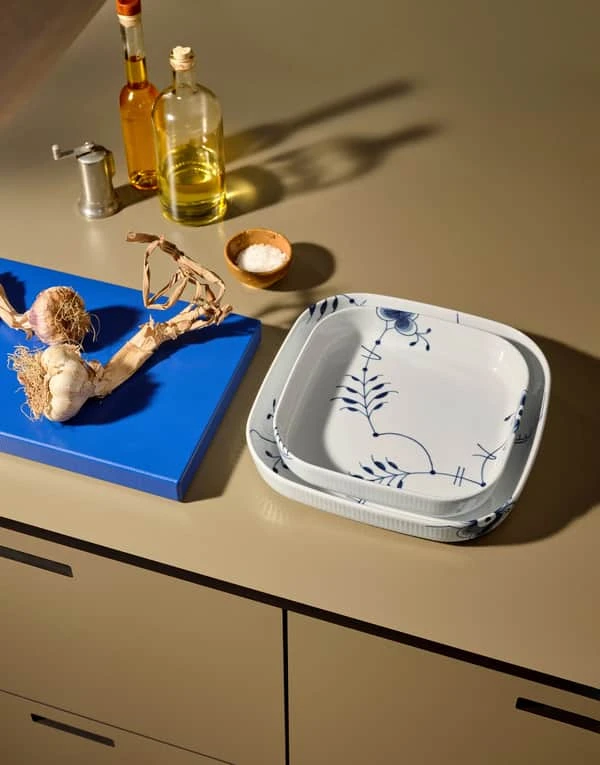 Det Blå Mega Riflet fad fra Royal Copenhagen er designet med fokus på æstetik og funktion. Derfor sikrer de udvendige rifler et godt greb, og de afrundede hjørner gør det nemt at rengøre. Fadet kan nemt gå direkte fra ovnen til bordet, så du får en elegant servering. Det Blå Mega Riflet fad fås i to størrelser, som let kan stables for kompakt opbevaring.