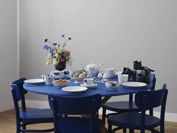 I 2000 skabte Karen Kjældgård-Larsen Blå Mega Mussel serien med inspiration fra det velkendte musselmalet – småt og blåt. Blå Mega Riflet er beviset på, at selv de bedste traditioner kan holde til at blive udfordret – stort og blåt. De store penselstrøg på det hvide porcelæn skaber et sofistikeret og kontrastfyldt udtryk, der klæder det moderne, nordiske hjem.