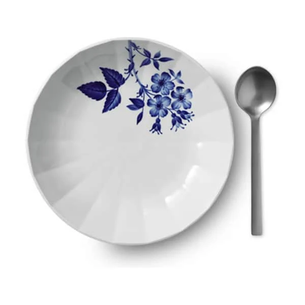 Royal Copenhagen har taget en moderne drejning på det klassiske blå blomstermotiv. Den blå rose står i kontrast til det kridhvide porcelæn, og får lov til at gro frit på tallerkenens bløde coupé-form. Den asymmetriske placering af blomsten skaber et moderne udtryk og giver din borddækning en moderne twist.