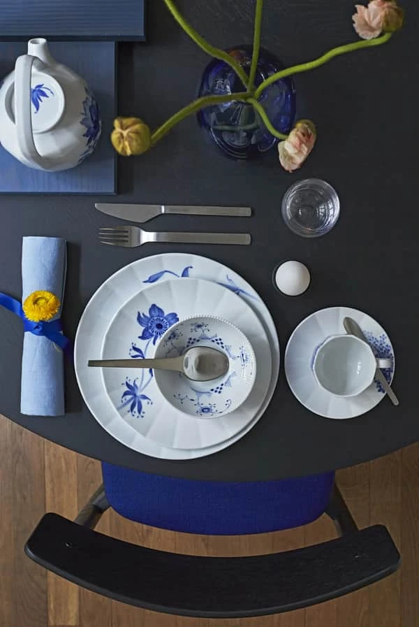 Stellet, Blomst, fra Royal Copenhagen er skabt i et møde mellem den traditionsrige kulturhistorie og et moderne designudtryk. Det klassiske blå blomstermotiv har fået lov til at gro frit på hvert element i serien. Hver tallerken, kop og underkop har sin egen enkelte påmalede blomst, som sammen skaber en dynamisk og livlig helhed, men samtidig giver hvert element sit eget individuelle look.