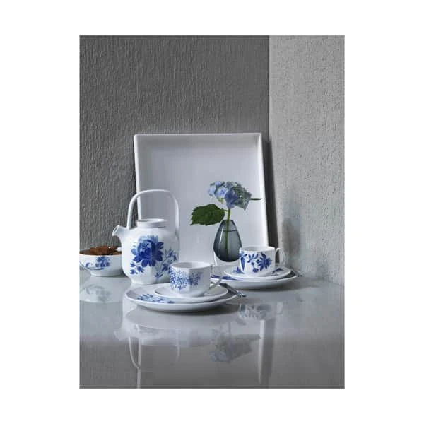 Stellet, Blomst, fra Royal Copenhagen er skabt i et møde mellem den traditionsrige kulturhistorie og et moderne designudtryk. Det klassiske blå blomstermotiv har fået lov til at gro frit på hvert element i serien. Hver tallerken, kop og underkop har sin egen enkelte påmalede blomst, som sammen skaber en dynamisk og livlig helhed, men samtidig giver hvert element sit eget individuelle look.