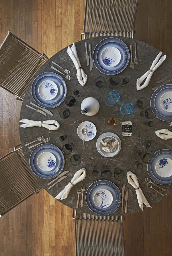 Stellet, Blomst, fra Royal Copenhagen er skabt i et møde mellem den traditionsrige kulturhistorie og et moderne designudtryk. Det klassiske blå blomstermotiv har fået lov til at gro frit på hvert element i serien. Hver tallerken, kop og underkop har sin egen enkelte påmalede blomst, som sammen skaber en dynamisk og livlig helhed, men samtidig giver hvert element sit eget individuelle look.
