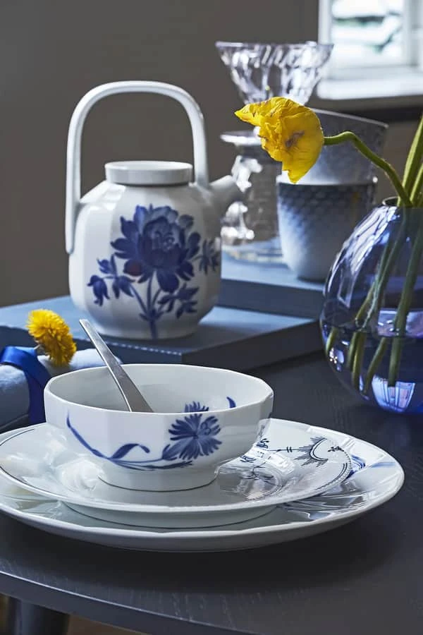 Stellet, Blomst, fra Royal Copenhagen er skabt i et møde mellem den traditionsrige kulturhistorie og et moderne designudtryk. Det klassiske blå blomstermotiv har fået lov til at gro frit på hvert element i serien. Hver tallerken, kop og underkop har sin egen enkelte påmalede blomst, som sammen skaber en dynamisk og livlig helhed, men samtidig giver hvert element sit eget individuelle look.