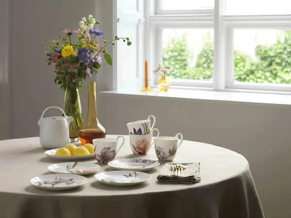 Hver steldel bærer på sit eget udsnit af blomster, som vi kender dem fra vores egne haver. Flora stellet er dekoreret med et unikt blomstermotiv, som hver især har sin helt egen betydning. Flora er en moderne fortolkning af det ikoniske Flora Danica stel, og giver på bedste vis de smukke blomstermotiver en enkel og eksklusiv elegance. Motivet er trykt med op til 20 farvelag og kanten er håndmalet med 23 karat guld.