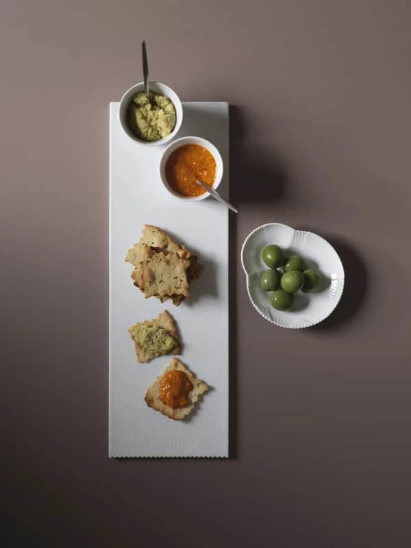 Serveringsbrættet fra Royal Copenhagens serie Hvid Elements er oplagt til servering af desserter, sushi, tapas eller forretter. Server retterne på dette elegante fad, og lad maden pynte på den hvide overflade.