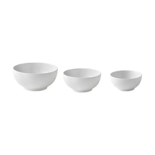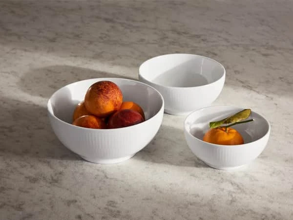 Et Royal Copenhagen skålsæt i tre størrelser i det rene ubemalede udtryk fra Hvid Riflet kan anvendes til et utal af smukke retter og serveringer. Sættet fås med størrelserne 43 cl, 73 cl og 110 cl.