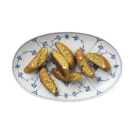 Elegant oval Musselmalet Riflet asiet fra Royal Copenhagen er en nytænkt klassiker. De fine streger i det håndmalede mønster giver asietten et forfinet strejf, det gør den perfekt som borddækningens fornemme midtpunkt. Asietten kan bruges som en flot desserttallerken, eller som en småkagetallerken til eftermiddagens kaffebord. Musselmalet Riflet porcelæn er en elegant tilføjelse til ethvert spisebord.