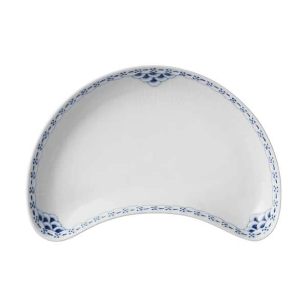 Denne Prinsesse Asiet fra Royal Copenhagen har en usædvanlig halvmåneform, og er en smuk tilføjelse til enhver Royal Copenhagen samling. Asietten tilfører et nutidigt udtryk til ethvert bord, og er også smuk som et lille pyntefad. Asiettens halvmåneform prydes af en håndmalet blondekant, der skaber et feminint udtryk på den organiske form. Den lille asiet er nyttig som en sidetallerken til brød og andet tilbehør eller et fad til småkager og snacks.