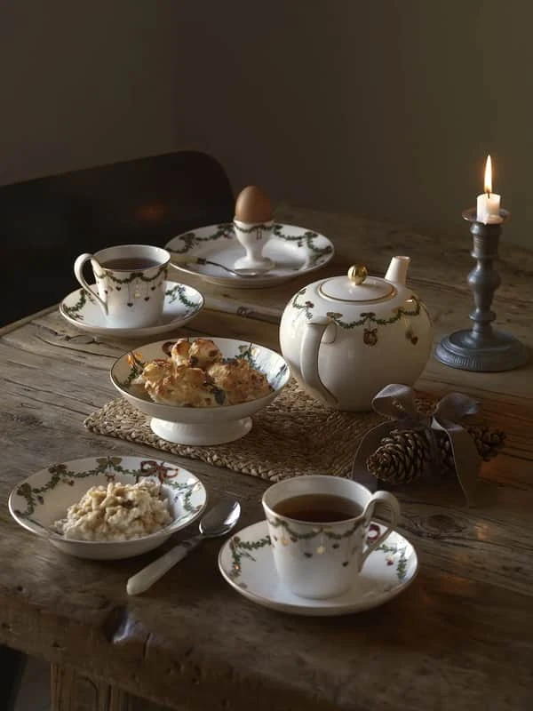 Stjerne Riflet serien fra Royal Copenhagen er stellet, hvor alt det bedste fra julen er samlet. Smukke guirlander hænger side om side med gaver og traditionelt julepynt – en klassiker i julen. Den smukke kollektion er skabt med inspiration i et stel, der blev produceret første gang i 1895, og i dag pryder Stjerne Riflet juleborde overalt i kongeriget.