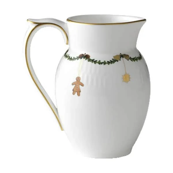 Hæld varm kakao til de mindste eller varm gløgg op til de voksne i kanden fra Royal Copenhagens julestel. Smukt rundt om kanden hænger julekransen med hyggelige juledekorationer på. Det kan man da ikke andet end at komme i julehumør af.