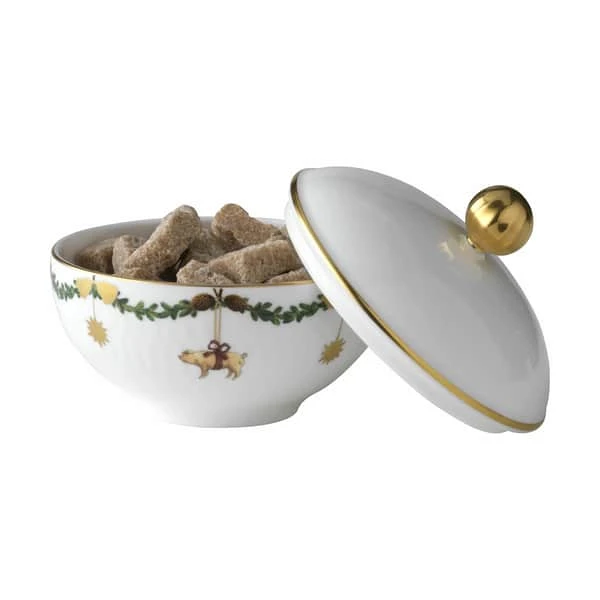 Sukkerskålen fra Royal Copenhagens julestel kan holde på alle julens lækkerier. Tag låget af og nap et lille stykke konfekt. Mums!