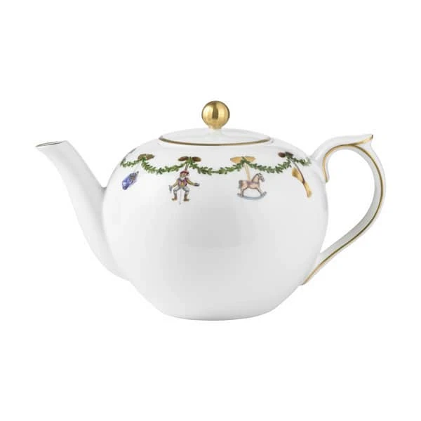 Servér teen til julekagen i denne klassiske tekande fra Royal Copenhagens julestel Stjerne Riflet. Stjerne Riflet-serien har julen som tema, og den fine dekoration med diverse julemotiver omkranser elegant det øverste af tekanden. Denne underspillede hyldest til julen passer perfekt til ethvert jule-hjem.